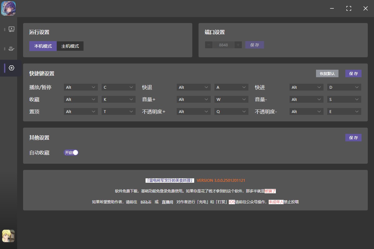 本软件可免费下载,基础功能免登录免费使用。若您是付费获取该软件,极有可能遭遇诈骗。若您希望支持作者,可前往 Bilibili 或作者直播间进行「充电」和「打赏」(iOS 系统请前往公众号操作),未成年人禁止进行相关投喂操作。